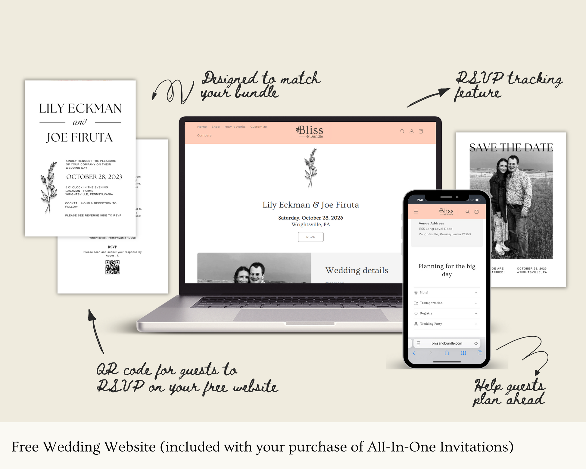 Help guests notice every detail and plan ahead with a completely coordinated bundle of Save The Dates, All-In-One-Invitations, Free Website and more.