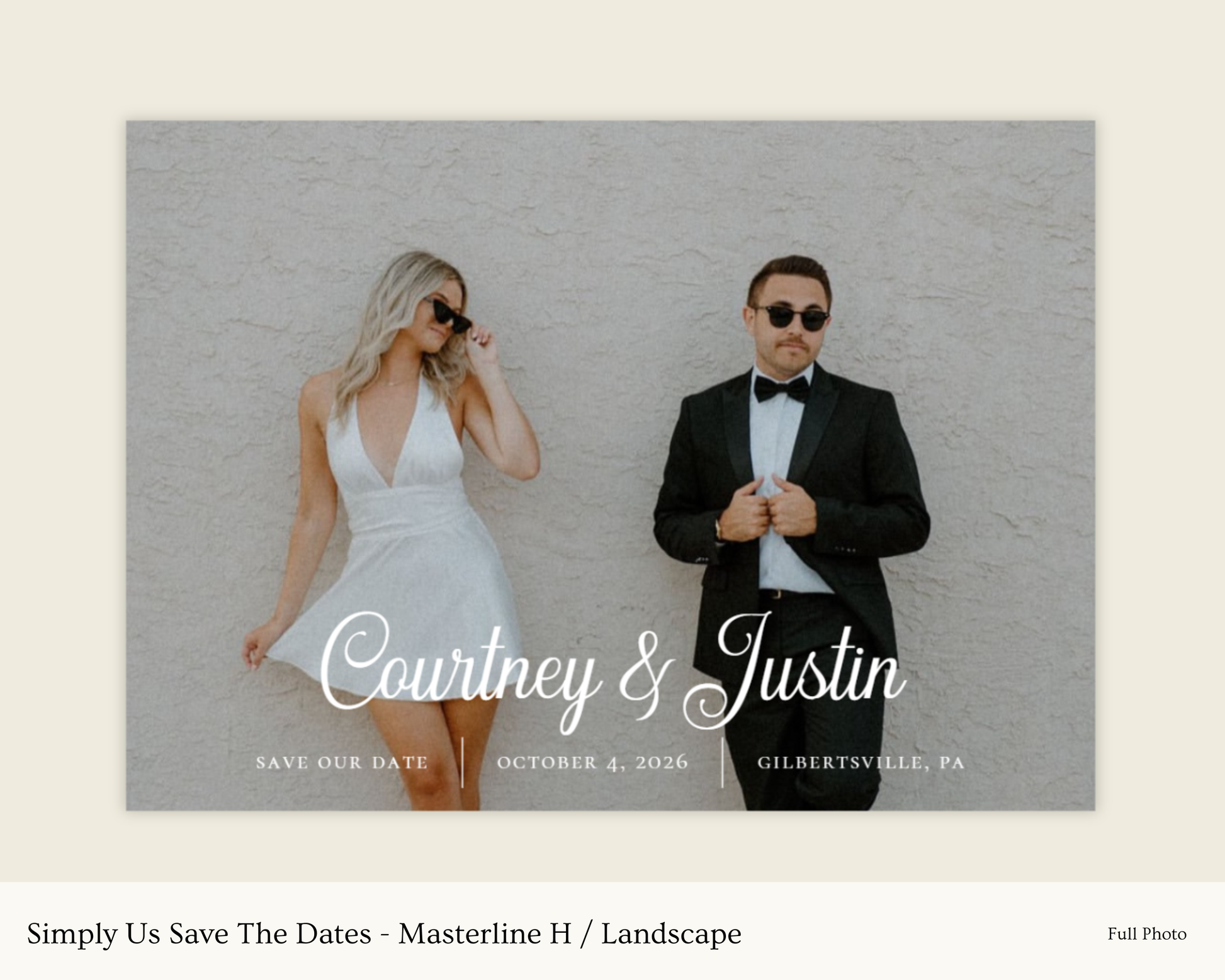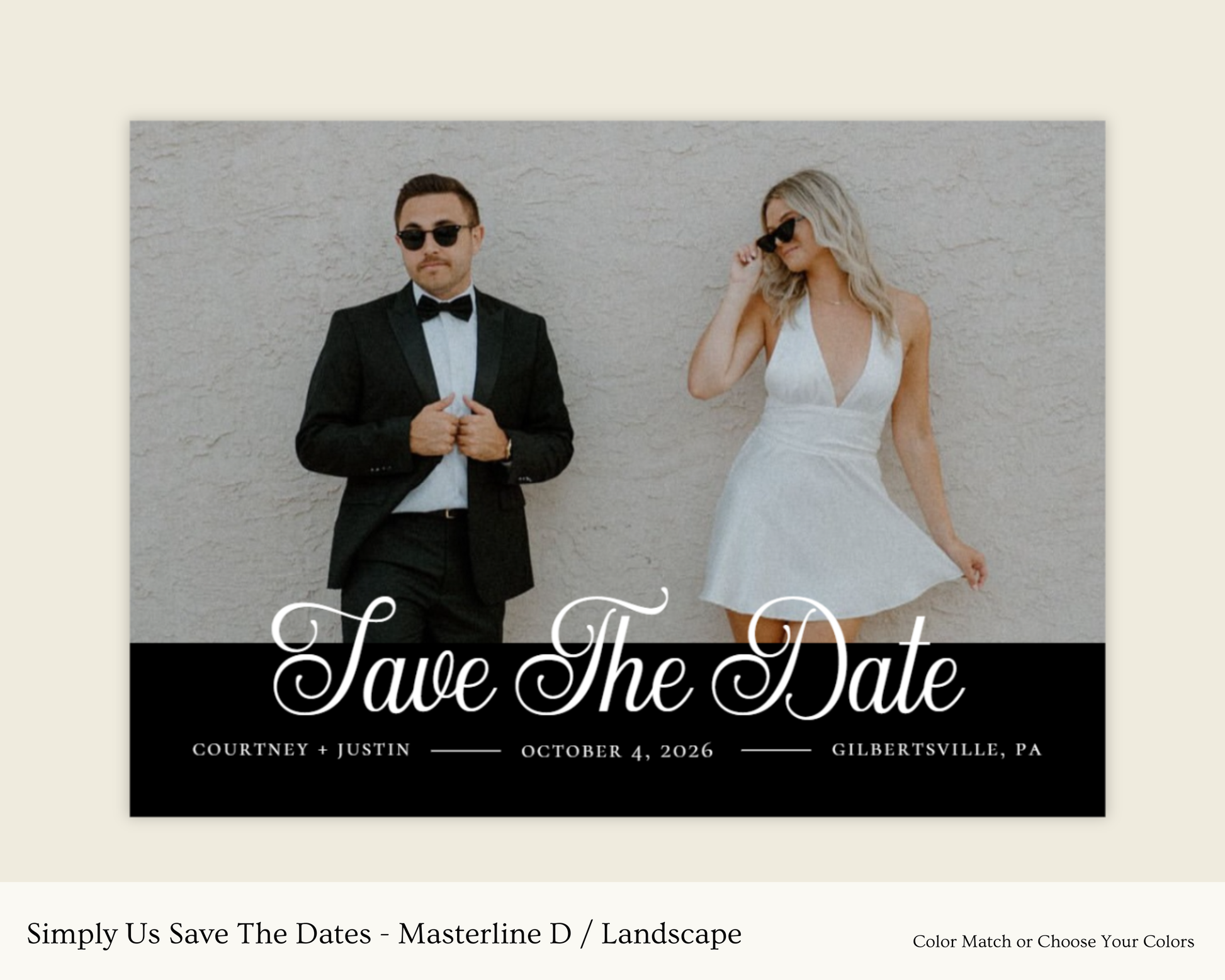 The Simply Us Save The Dates Collection is timeless, minimalist and beautifully yours. 100% guaranteed to find the perfect fit for your photo with details expertly placed. When purchased, you’ll receive a PDF proof featuring your uploaded photo in 11 curated design variations (A-K)—giving you the freedom to choose your favorite before printing.