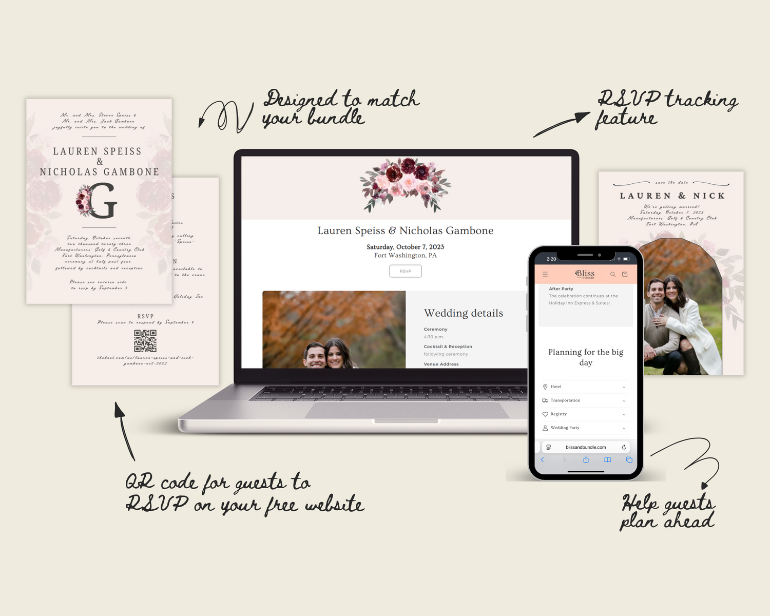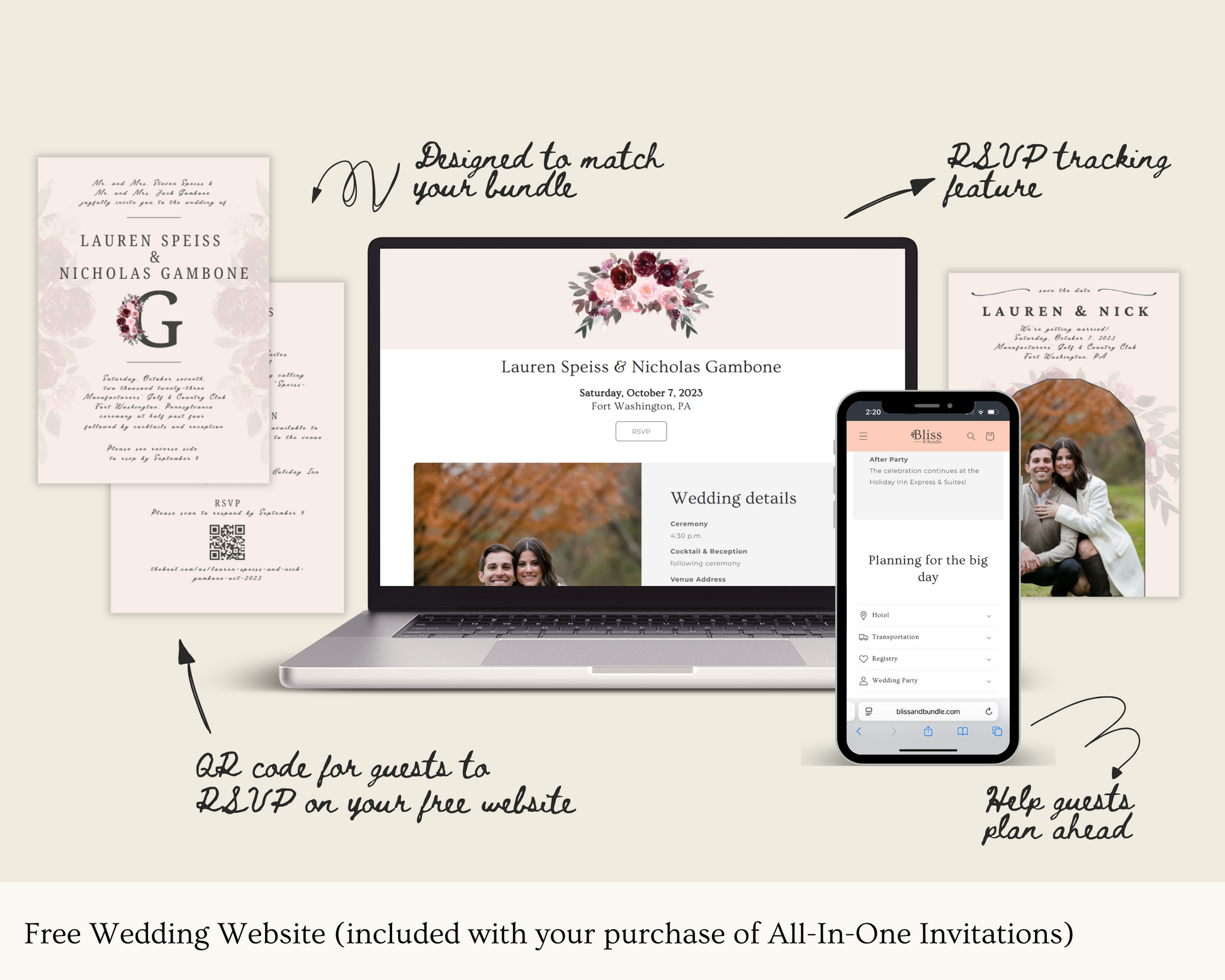 Help guests notice every detail and plan ahead with a completely coordinated bundle of Save The Dates, All-In-One-Invitations, Free Website and more.